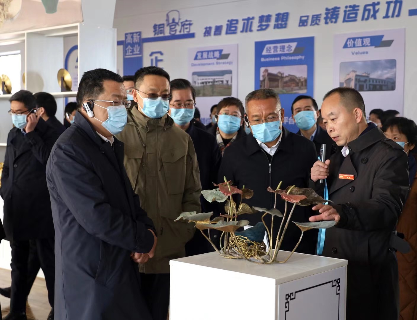 1月12日下午,中共銅陵市委十屆十四次全體(擴大)會議期間,市委書記丁純,市委副書記、市長胡啟生及各市直部門、開發(fā)園區(qū)和縣區(qū)主要負責人等近百人,現(xiàn)場觀摩銅官府銅藝產(chǎn)業(yè)園。全體委員還集中參觀了全國景泰藍職業(yè)技能競賽參加決賽選手作品以及趙敏的寫真銅藝作品等。